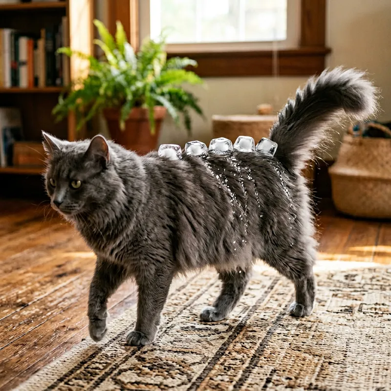 Visualize a scene featuring a grey cat. The feline exhibits a calm demeanor, strolling casually. However, there is an unusual sight as there are several ice cubes neatly resting on its tail and slowly melting. The droplets of water from these melting ice cubes glisten against its fluffed-out grey fur, creating a unique contrast. Make sure to vividly depict the intriguing interplay of cold, wet ice cubes with warm, soft fur. The cat's indifferent attitude towards this unusual circumstance intensifies the peculiarity of the situation.