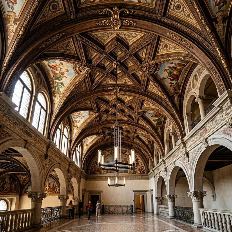 A grand ceiling line of a traditional Italian architecture, with intricate details and elements reminiscent of the Grilliato style. The high ceiling is adorned with ornate patterns and molded embellishments typically found in classical designs. Natural light filters in through large windows, meticulously casting an inviting glow over the entire interior space. Intricately carved wooden beams crisscross across the ceiling, demonstrating the craftsmanship and attention to detail when designing this masterpiece. Modern light fixture hangs from the center, serving as the focal point while accentuating the grandeur of the ceiling line.