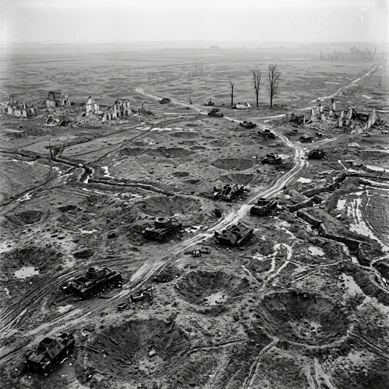 An aerial depiction of a desolate, war-torn battlefield that shows the scattered remnants of the conflict. This imagery should evoke the style of a historical documentary photograph, showcasing the scale of devastation at a distance. The image should be a black and white, high-contrast rendering that underscores the grim aftermath of the battle. Elevate the representation to illustrate it was photographed using a wide angle lens, much akin to modern drone camera capabilities.