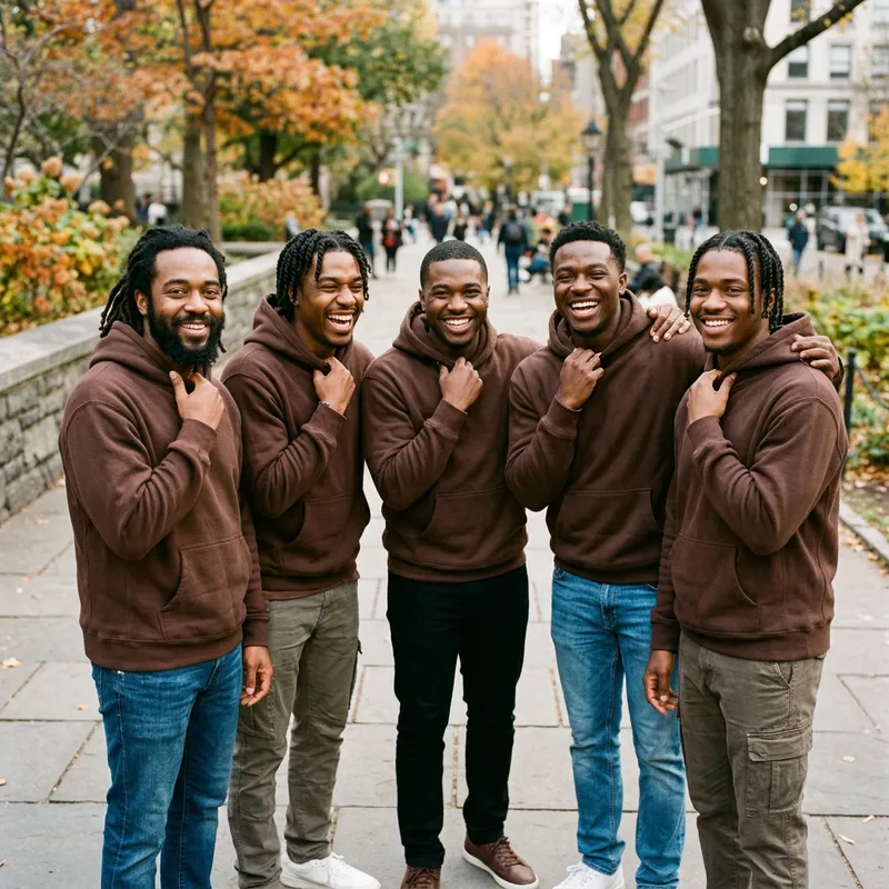 group of black men together in brown hoodies holding the neck base of the hoodie.