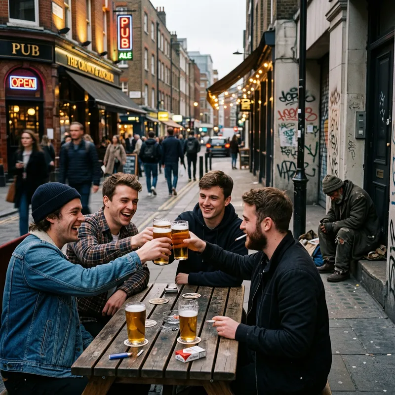 Four Caucasian young men, around 22 years old, are enjoying a chilled beer and a cigarette in an urban setting. They raise their glasses together in a toast. In the background, a man of unspecified ethnicity and appearance, potentially homeless based on his clothing and state, seems to be unwell.