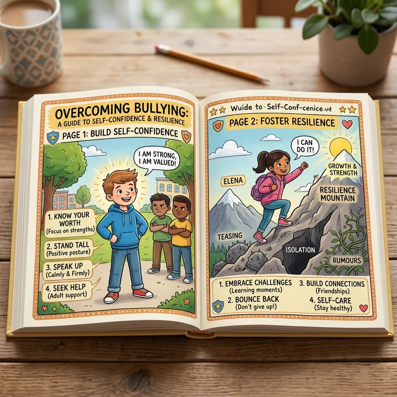 An illustrative display of a guide on overcoming bullying through self-confidence and resilience. The guide should be an open book laid flat on a wooden table, its pages filled with vibrant, colourful illustrations. On the left page, there's a depiction of a young Caucasian boy standing firm in the face of three bullies, his posture reflecting self-confidence with a smile on his face. On the right page, a Hispanic girl climbs a metaphorical mountain labelled 'resilience', with challenges labelled as 'teasing', 'isolation', and 'rumours' on the steep slope below. The background can have a soft, calm colour tone to complement the theme.