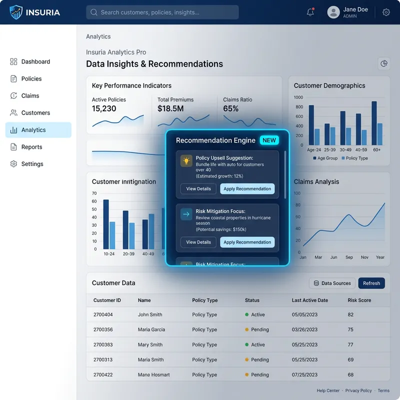 A screenshot of a generic insurance software platform with various functionalities such as customer data processing and analytics tools. The new recommendation engine features in the analytics tools are emphasized in the image and highlighted. The software has data charts, graphs, and tables showing relevant information. The user interface is sleek, intuitive, and has a modern contemporary aesthetic with colors such as blue, grey, and white dominating the platform.