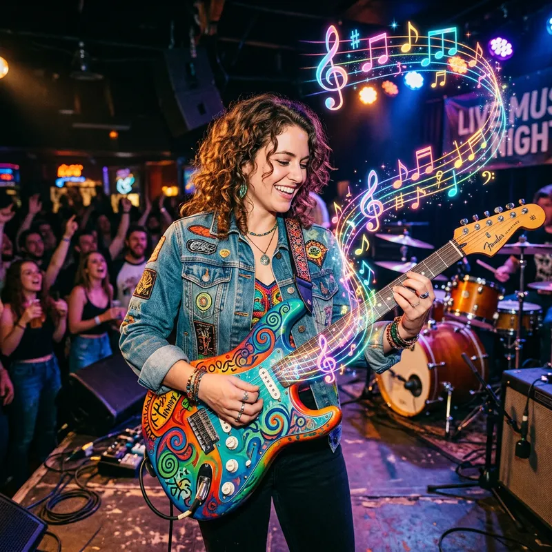 Colorful Guitar Emitting Musical Notes