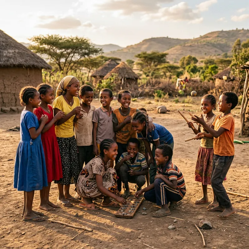 A group of East African children of Ethiopian and Eritrean descent, with a mix of boys and girls, happily gathered together in a sunlit outdoor setting. They express joy and camaraderie, with smiles on their faces. Some of them are engaged in light-hearted conversation, while others are joyfully playing traditional games. The scene radiates a genuine sense of happiness, friendship, and unity.