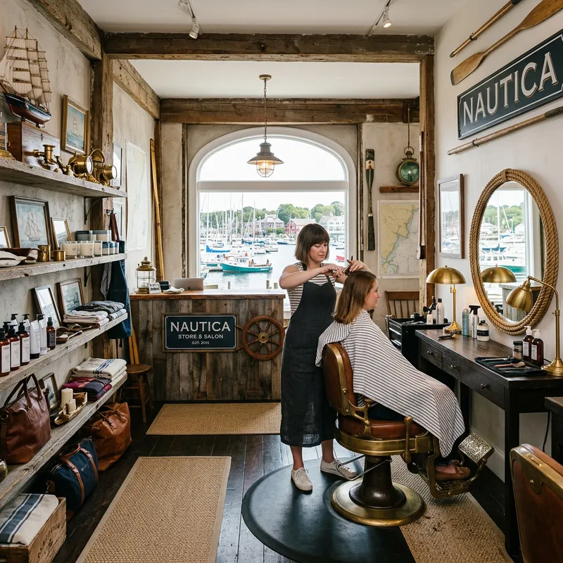 Beautiful Nautical Store, Hair studio, interior design photography, high quality.