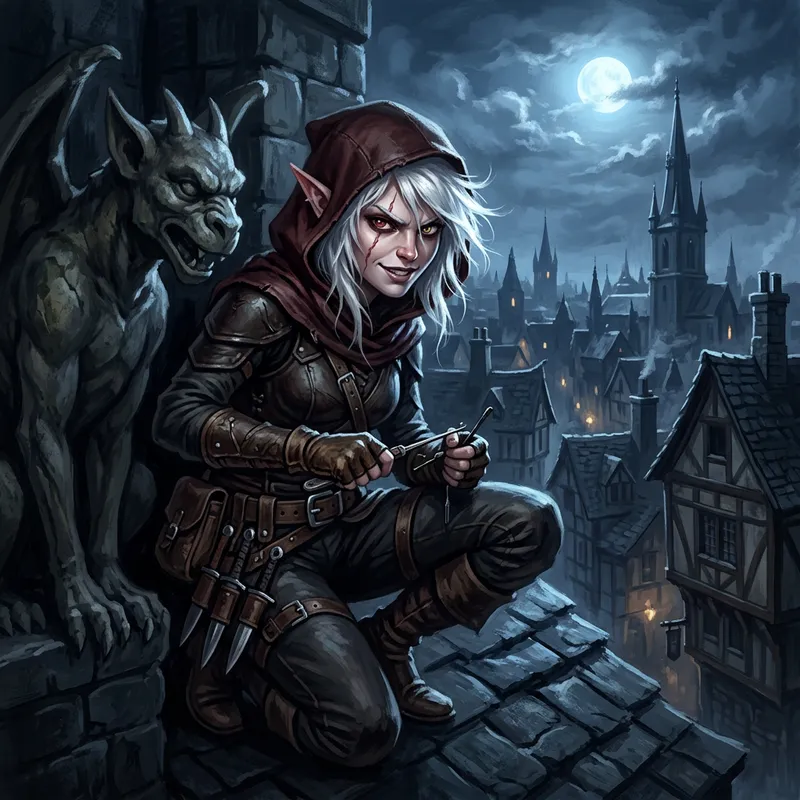 Half-Elf Rogue Concept Art: Moonlit Cityscape Illustration