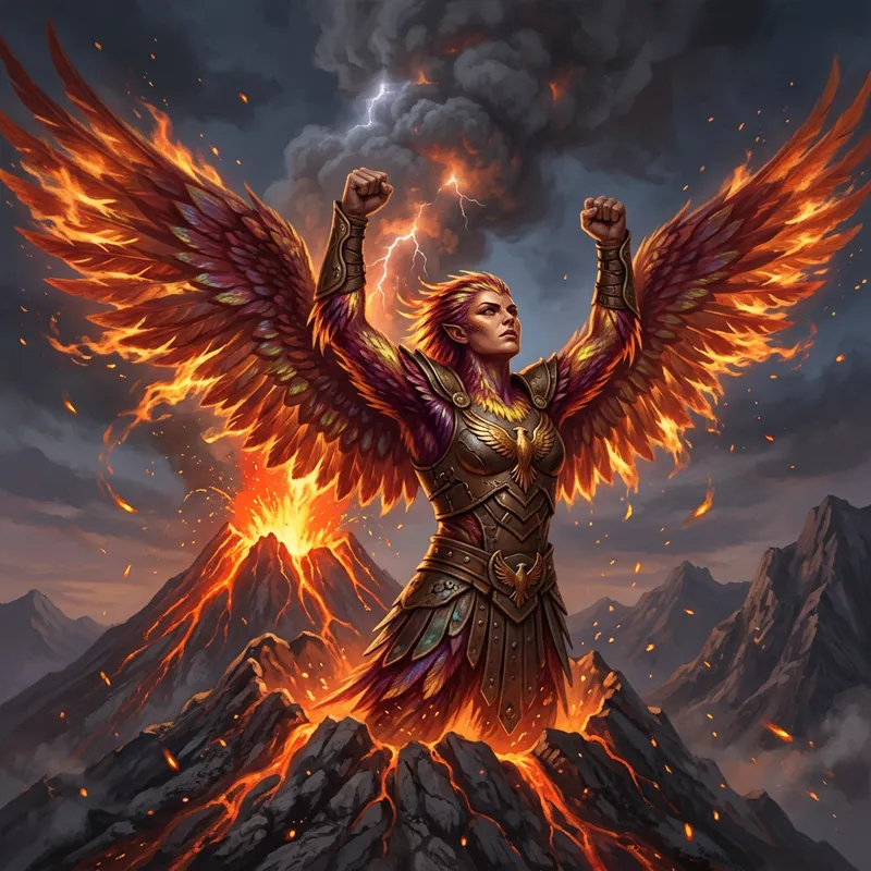 An image featuring a mythological figure that is half-human and half-phoenix, rising majestically from the peak of an erupting volcano, its radiant wings outspread widely. Instead of giving an offensive hand gesture, it raises its fists high in defiance, demonstrating resilience and courage in the face of nature's fury.