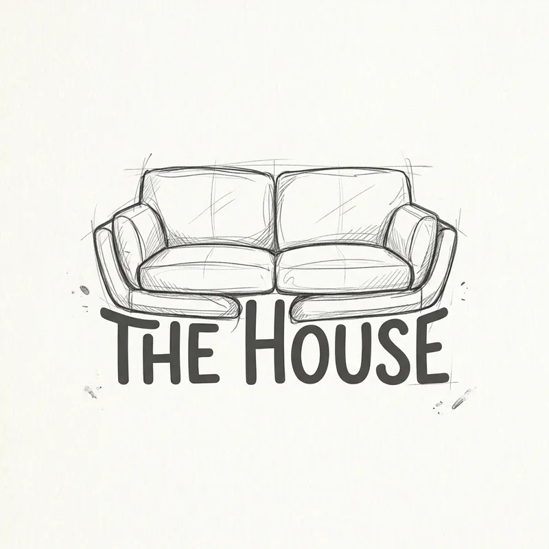 Create a hand-drawn logo design featuring a sofa resting on top of the words 'The House'. The bottom part of the sofa should seem to merge with the letters, as though it were hugging them. The sofa should appear intentionally unfinished, indicating that design work is in progress, but it should still be clearly recognizable as a sofa. The logo should exude a blend of comforting and contemporary vibes, embodying both the concept of home and the principles of modern design aesthetics.