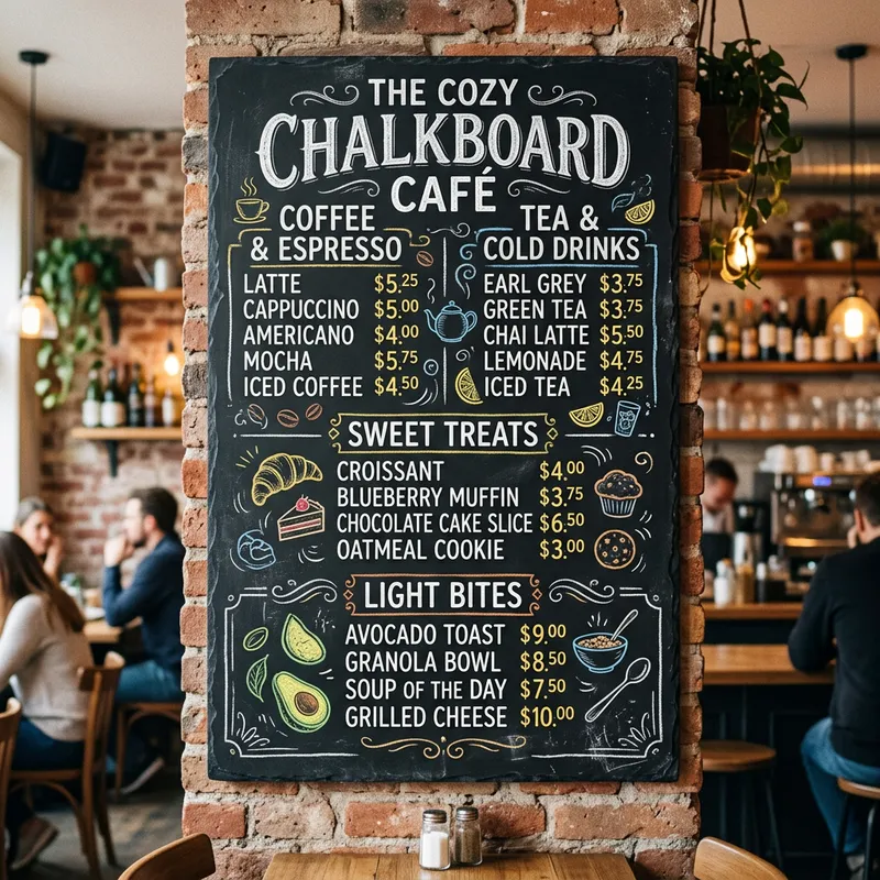 Hand-drawn style cafe menu on blackboard with chalk lettering, illustrations, and smudge effects.