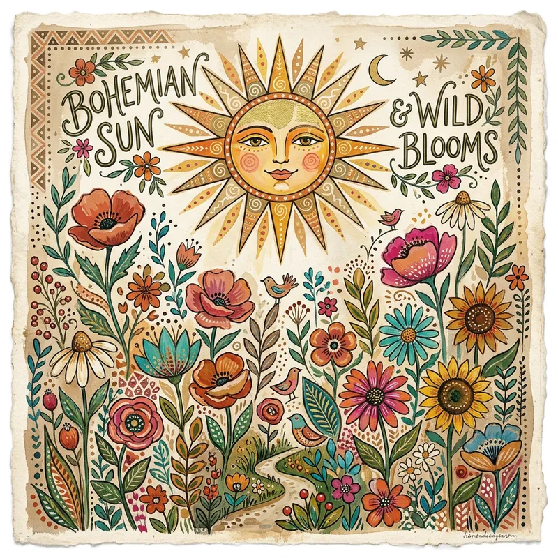 Hand-Painted Bohemian Art with Flowers and Sun