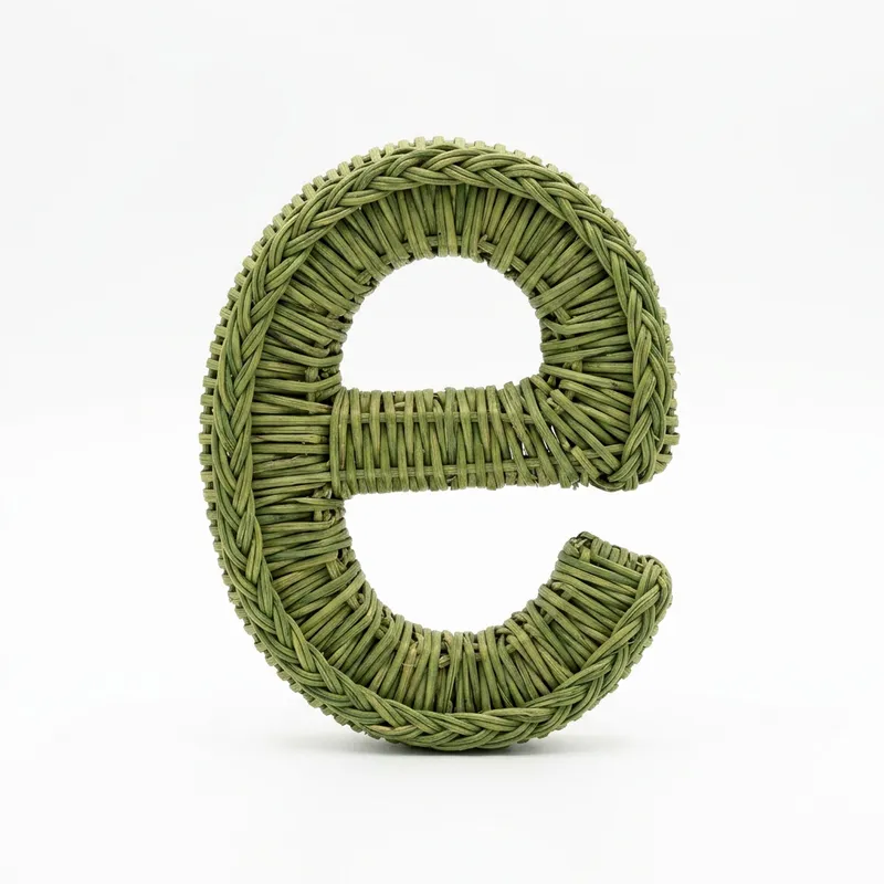 An image of a lowercase 'e' designed like a green handcrafted basket. The letter sits on a pure white background and there are no shadows cast.