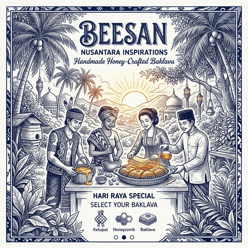 Create an intricate and immersive visual representation with a dimension of 23 cm in height and 16 cm in width, oriented horizontally. This image is specifically for the packaging and digital interface of a Hari Raya special Baklava version, inspired by the fusion of various cultures from Nusantara. Incorporate the exquisite use of sketching and shading techniques to devise feature-detailed illustrations, with an emphasis on a color palette dominated by shades of navy and white, embodying an aura of simplicity and refined elegance. The design should maintain minimalist aesthetics. Envision a magical scenery of an orchard, surrounded by coconut palm trees, rolling hills, and a setting sun, radiating warmth. Include ethnically diverse characters, symbolizing Dayak, Sumba, Javanese, and Sundanese cultures, collaborating in this rustic setting under the shady trees. The unified harmony of the unique ingredients coming together should subtly present the formation of a baklava at the heart of the illustration. Leave strategic space for branding and user interaction elements. Integrating the company's branding, 'BEESAN,' 'Nusantara Inspirations,' and 'Handmade Honey-Crafted Baklava' creates a personalized user experience. Simultaneously, introduce interactive dot elements in the UI for a creative and engaging user experience. The shift towards sketching and shading techniques would give the image a hand-drawn feel, adding depth and richness to the overall design.