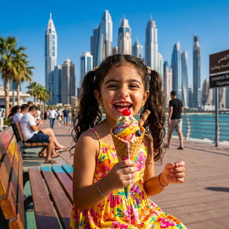 Happy 6-Year-Old Girl Eating Ice Cream in Dubai