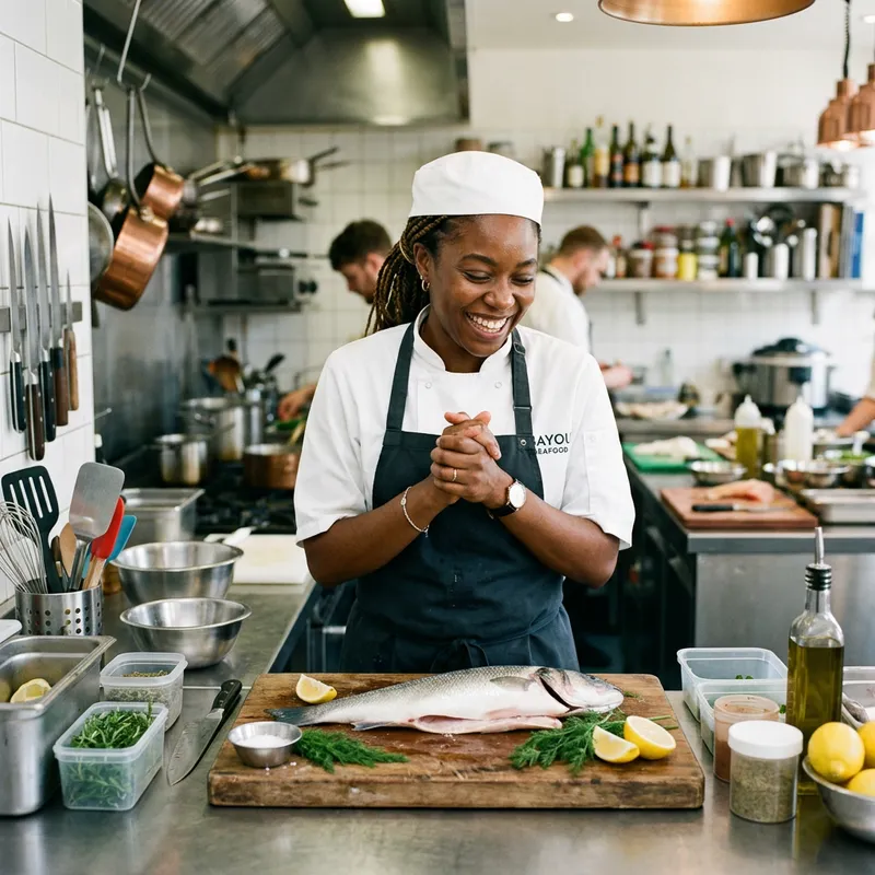 The scene is taking place in a seafood kitchen. The chef, a black woman hands clasped in delight, is seen perfecting her culinary skills on a fresh cut fish that lies on a chopping board. Her face beams with happiness and satisfaction. The fish is visibly fresh, with a shiny silver look and a deep cut along its body readies it for cooking. The kitchen is well lit, reflecting cleanliness and professionalism. Kitchen tools like knives, spatulas and mixing bowls populate the counter, suggesting a bustling cooking environment.