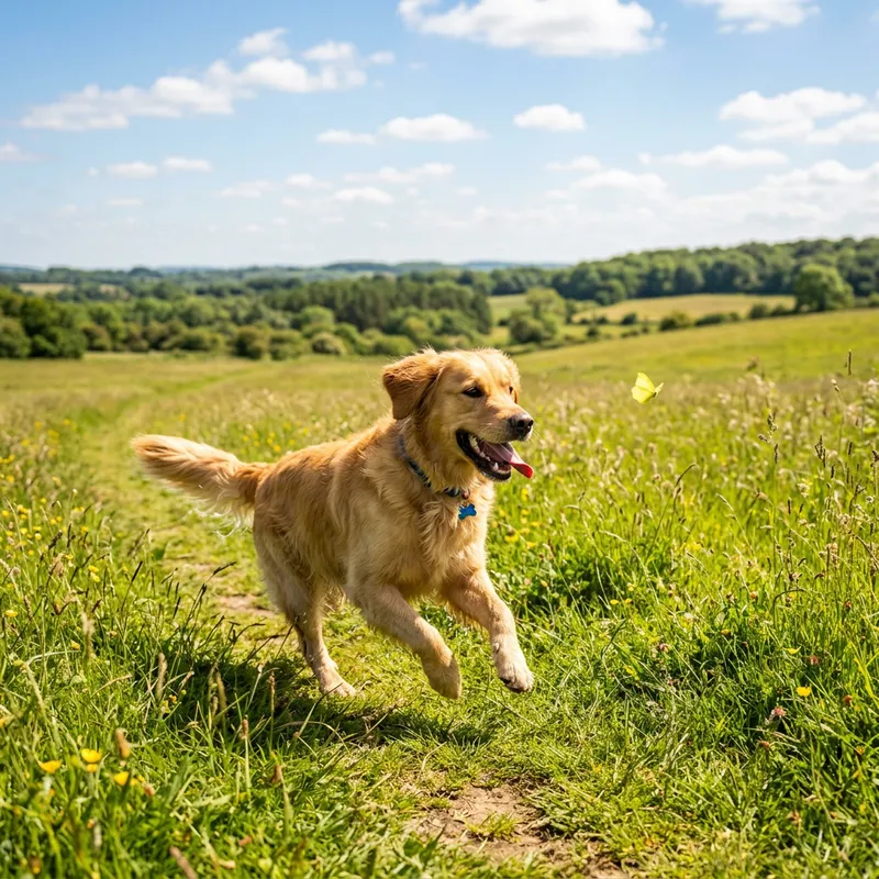 An image of a dog. The dog is happily running in a large green field, its tongue hanging out as it playfully chases a yellow butterfly. The sun is shining brightly in the sky, filling the scene with warm daylight.