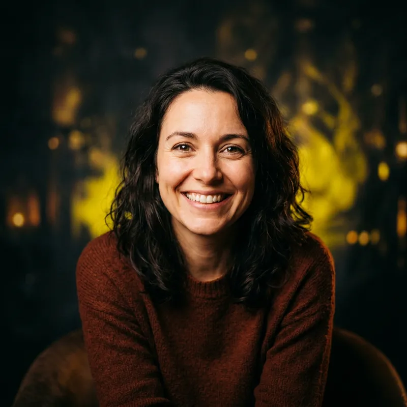 A happy person looking towards me, with a background that is dark with shades of yellow with the hex color code 'edda31'. This person emanates positivity and warmth, their face lit by a contented smile. Their eyes, glittering warmly, are directed towards the viewer - creating an intimate connection. Contrasting this, the background is a dark, almost black, canvas. Hues of yellow, particularly a vibrant shade denoted by the hex code 'edda31', splash across this canvas, adding an element of depth and intrigue to the scene.