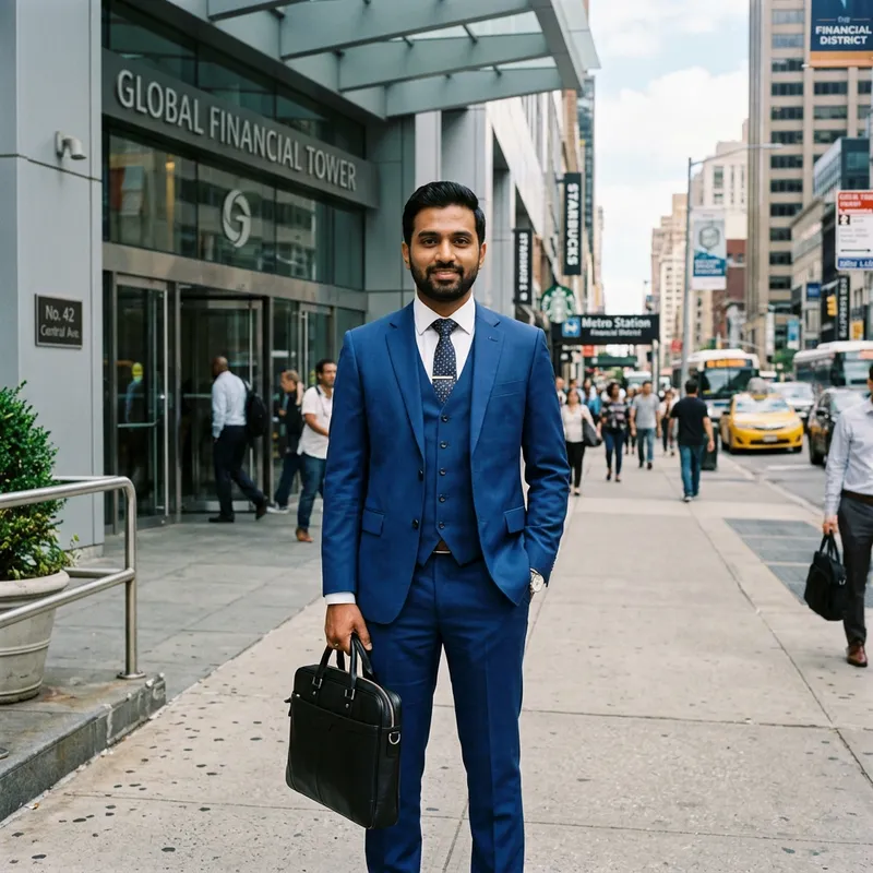 An image of a man named Harish, who is of South Asian descent, has black hair, and is in his 30s. His eyes are dark brown, and he has a calm demeanor. He is standing in front of an office building, clad in a royal blue suit and holding a black briefcase in his right hand. His left hand is tucked into the pocket of his suit trousers. In the distant background, one can see the hustle and bustle of the city. The scene captures a regular day in the life of Harish, a professional in the corporate world.