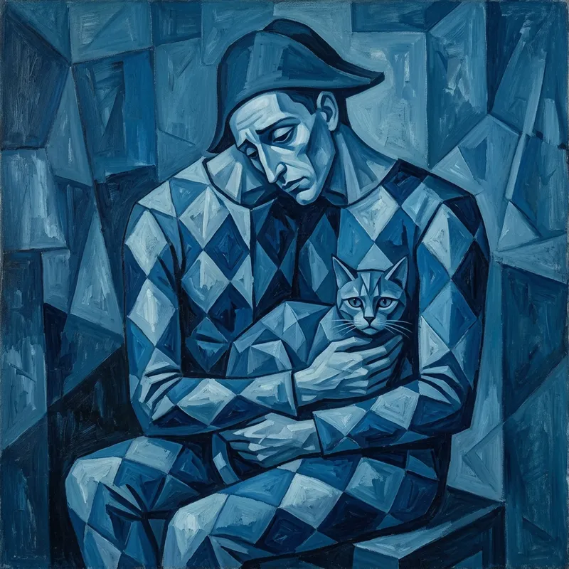 Generate an image that employs the use of monochromatic shades of blue, displays abstract distortions of form, and conveys a mood of melancholy reminiscent of art from the early 20th century. The subject of this image is a harlequin, featuring a checkerboard pattern outfit, holding a cat. The scene should reflect the same cubist influence as work from the historic Blue Period.