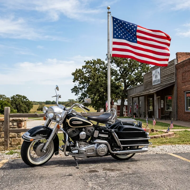 A classic Harley Davidson motorbike parked neatly. The backdrop features a vibrant United States flag fluttering proudly in the wind. Please omit any depiction of firearms or weapons in this image.