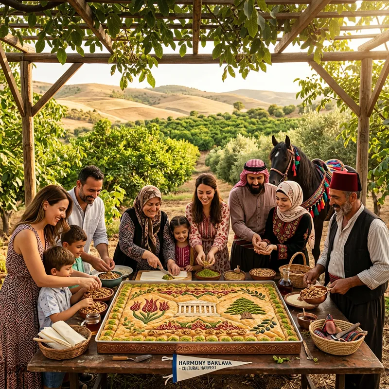 Visualize a sun-kissed landscape featuring a lush walnut orchard nestled between vibrant pistachio groves and undulating hills. Multiple groups of people, including a Turkish family from Gaziantep, a Middle-Eastern couple from Syria on horseback, a Caucasian family from Athens, Greece, and a Middle-Eastern farmer from Beirut, Lebanon all converge in the orchard. Their collective effort yields a glorious baklava, symbolizing the harmonious blend of their diverse backgrounds. The baklava is adorned with symbols representative of each culture, a brocade of culinary delight. This image is a testament to the magic that can result from cultural collaboration and nature's contribution in creating something truly extraordinary.