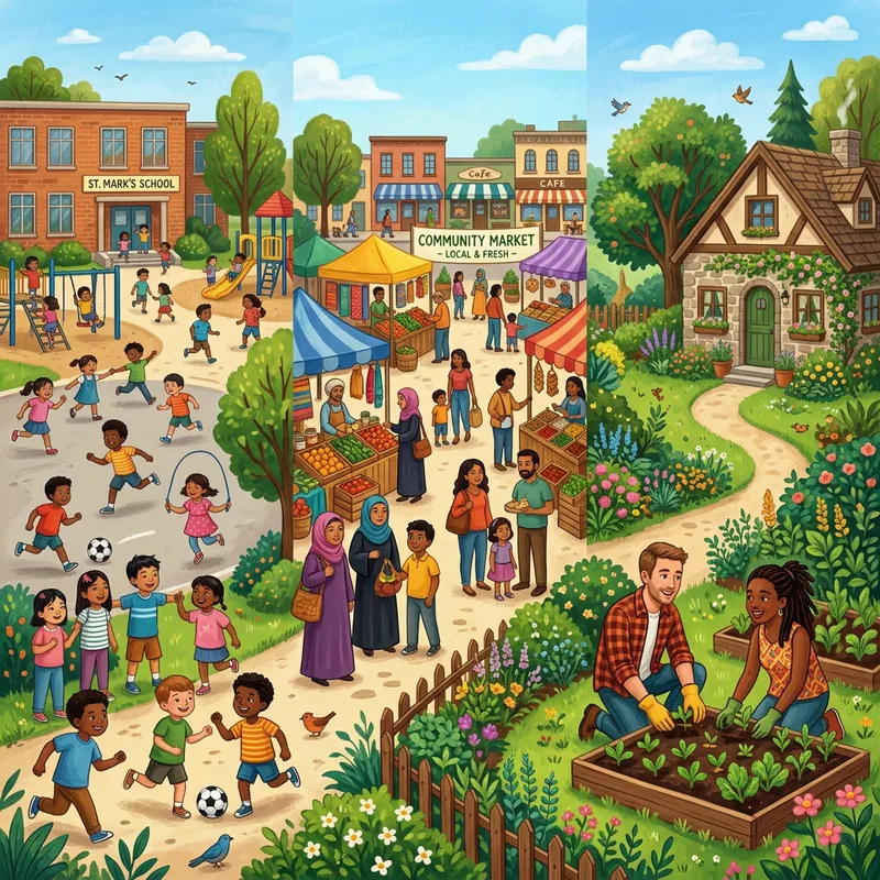 Illustrate a scene where a three-part landscape exists - a school on the left, the community in the middle, and a home on the right. The school is buzzing with activity, children of various descents, like Caucasians, Blacks and South Asians, are seen playing in the yard. The community area shows a vibrant local market with people of Middle-Eastern and Hispanic descents browsing through the stalls. At the far right, there lies a quaint little house, cozy and welcoming, surrounded by a lush green lawn where a Caucasian male and an Afro-American female are gardening. Emphasize the harmony and cooperation present.