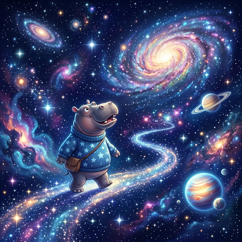 Harold the hippo, stood in awe as he traversed across the vibrant, star-lit night's sky. He admired the astonishing display of galaxies, sparkling stars, and bright planets, revealing the infinite beauty and vastness of the universe. The celestial spectacle captured his attention and filled him with a deep sense of insignificance, yet a heartwarming feeling of being part of something truly magical.