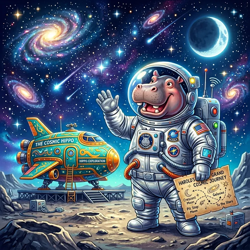Imagine a fun and adventurous scene. Harold, a friendly and exuberant hippo, embarks on an incredible journey to the cosmos. He dons his shiny, silver astronaut suit equipped with the latest gear designed for a hippo's stature. Behind him, a grand spaceship, painted in bright hues of teal and gold awaits. The crystalline azure star-studded sky overhead is filled with a magnificent flurry of pulsating galaxies and shooting stars. In the distance, the glowing crescent moon serves as his first pit-stop. In his paw, Harold clutches a faded map guiding his cosmic adventure.