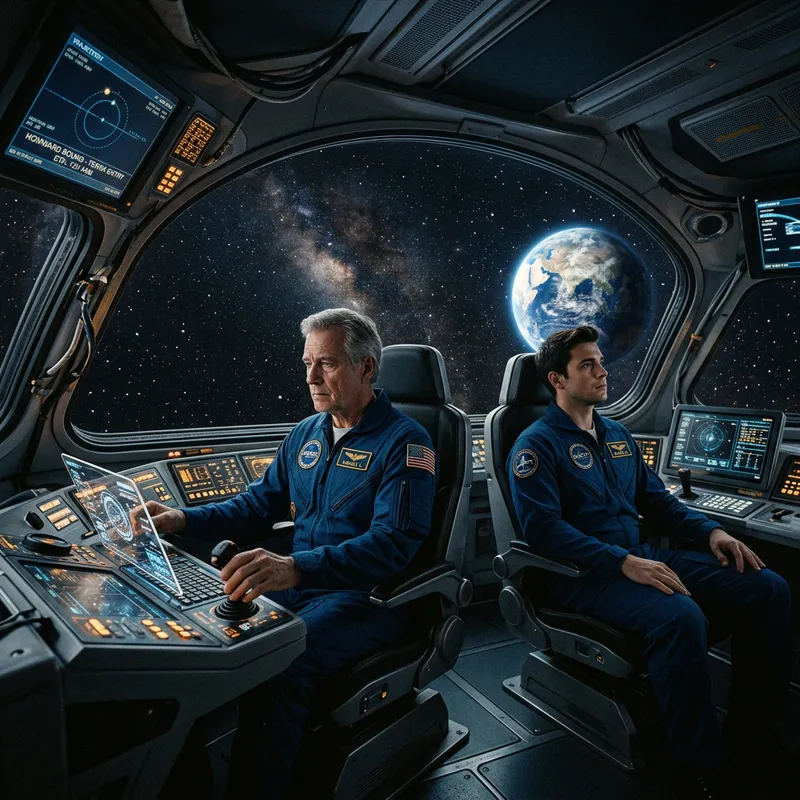 Harold and Oliver are in the process of piloting a spaceship back to Earth. The background showcases the vast expanse of space, with innumerable stars twinkling in the dark vacuum. The spaceship is futuristic and sleek with advanced control panels. The return journey is imbued with a sense of melancholy, a bittersweet farewell to the galaxy and their adventurous journey within it.
