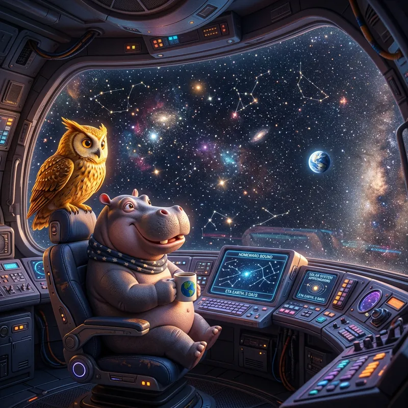 Harold, a cheerful and plump hippo, and Oliver, a wise-looking owl with golden feathers, are seen inside a sleek, futuristic spaceship filled with blinking control panels and intricate machinery. There is a large window showing the mesmerizing backdrop of constellations and distant galaxies fading away as the spaceship starts its journey back to Earth. The inside of the spaceship is illuminated by gentle, ambient lighting which creates a feeling of anticipation mixed with a hint of sadness, signifying a bittersweet farewell to the boundless universe.