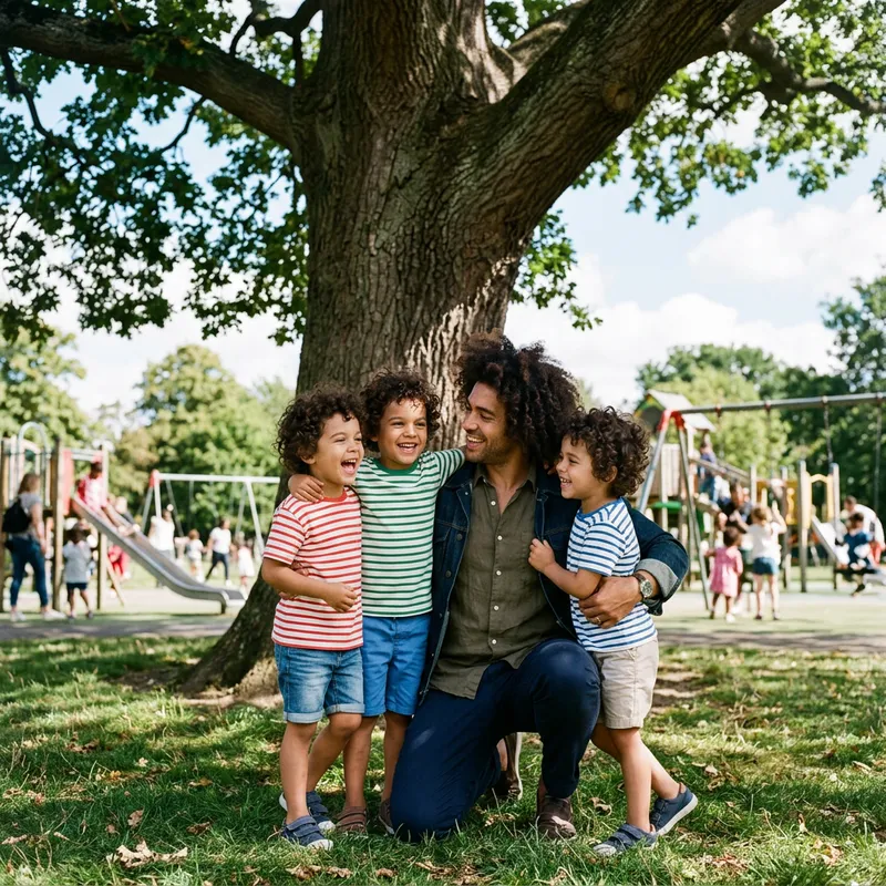 A man with boy triplets, having similar curly hair and charismatic personality as a popular male singer. The man is in his late 20s, with a charming smile and stylish contemporary wardrobe, while the triplets are around 5 years old, each wearing a different color striped t-shirt. They are happily spending time in a sunny park, under a large oak tree. The man is kneeling down to their height, looking at them affectionately. In the background, there is a playground with other children playing.