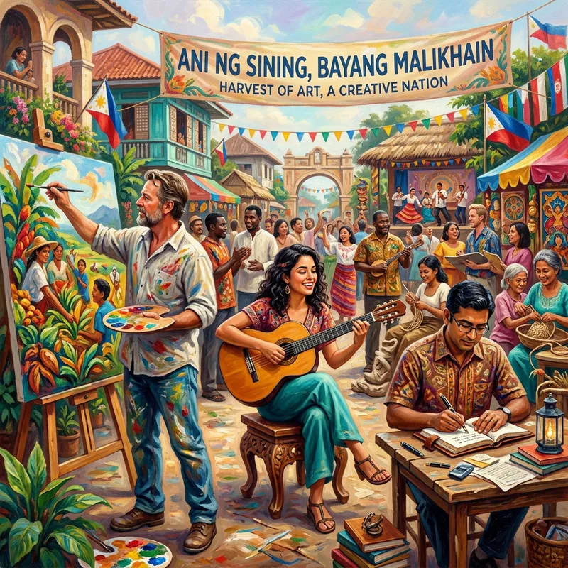 Create a vibrant painting resonating with the theme 'Ani ng Sining, Bayang Malikhain', translated in English as 'Harvest of Art, a Creative Nation'. The scene must include an array of artistic activities such as painting, music, and literature being performed by individuals of different descents and genders. To the left, a middle-aged Caucasian man is passionately painting a mural on a canvas, in the center a young Hispanic woman is gracefully playing a classical guitar, and on the right, a South-Asian male author is creatively penning down a story. The background should consist of a integrating shades of different cultures together suggesting a unified creative nation.