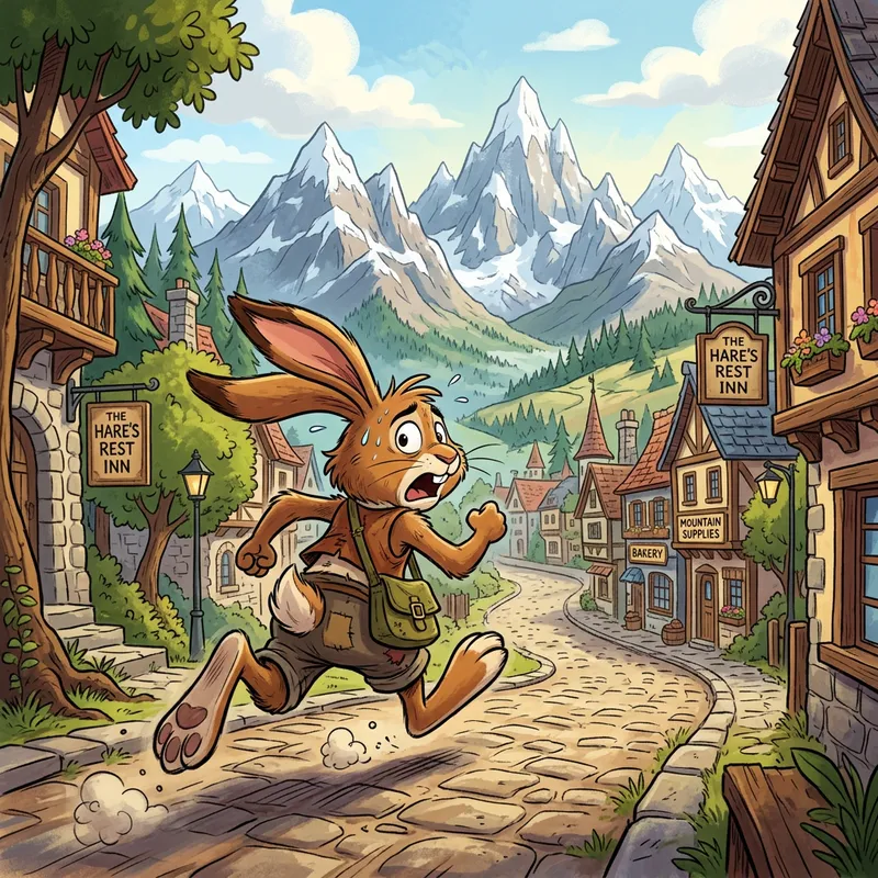 Hare, running on two legs, street, mountains, running away, cartoon design.