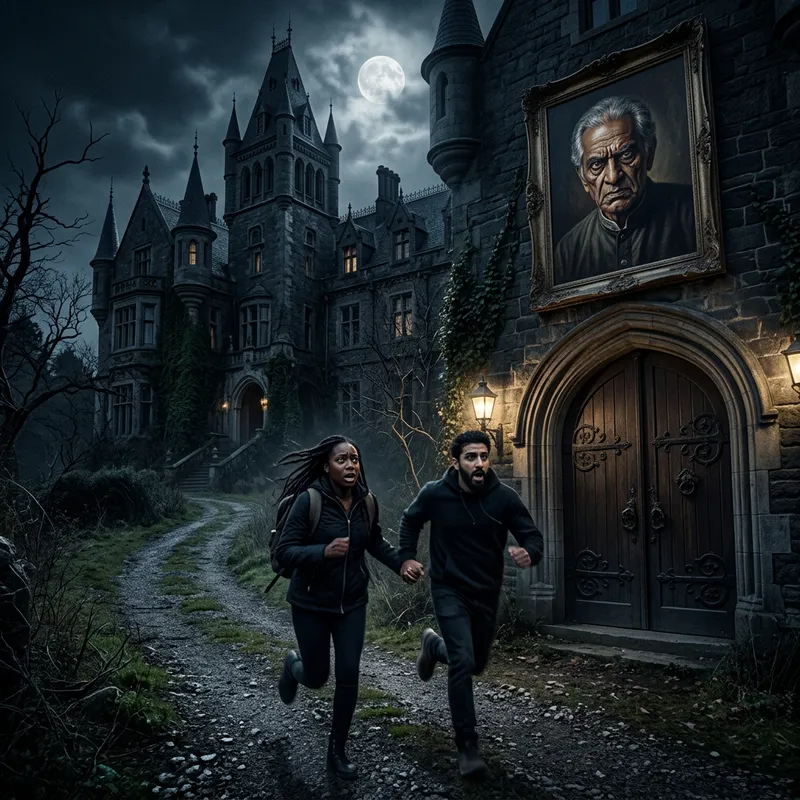 A terrifyingly grand mansion stands tall in the eerie moonlight. A scare-inducing painting of an elderly Indian man with an unsettling expression greets all who dare to approach. In the foreground, a couple, a Black woman and a Middle-Eastern man, hurtle towards the mansion's formidable door with expressions of sheer terror etched on their faces.
