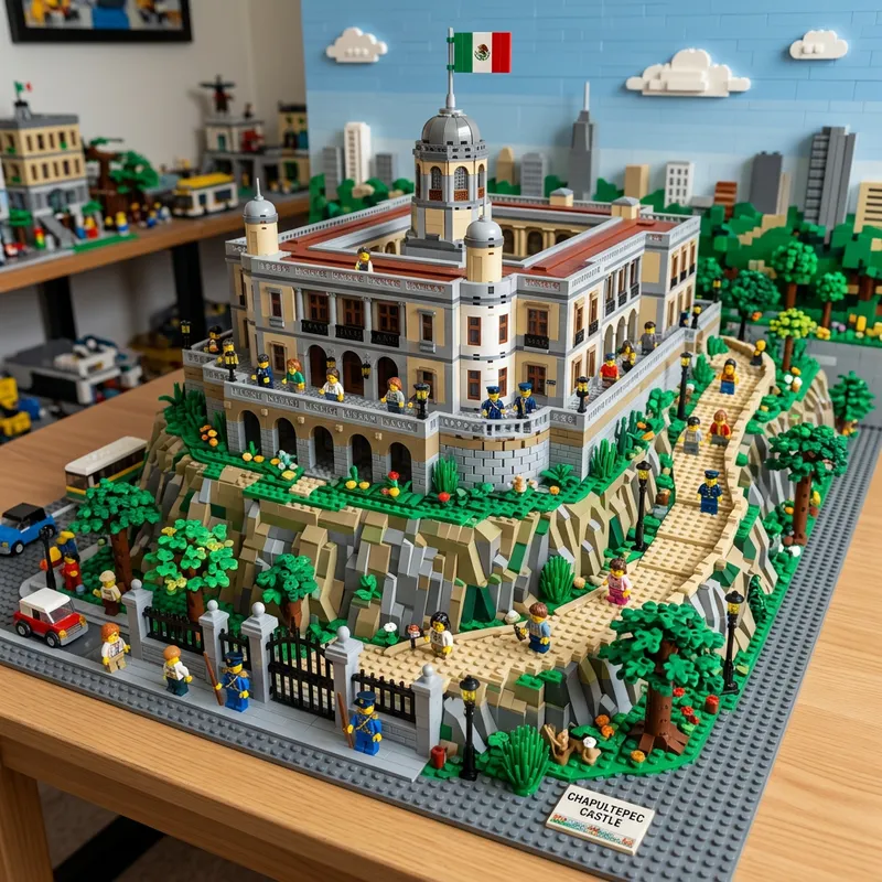 Create an image of the Chapultepec Castle in Mexico, an authentic scene built with real LEGO pieces, using real bricks, miniature figures, and the entire environment as if it were a construction set. Do not change anything from the original composition.