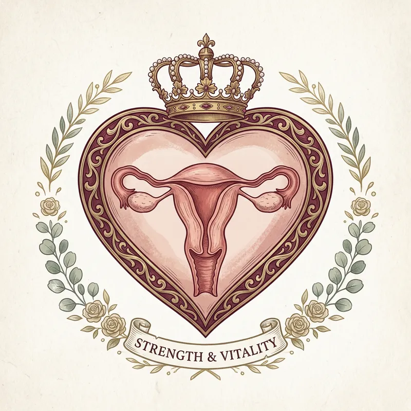A heart shape adorned with a crown at the top. Inside the heart, there is an illustration of a uterus.