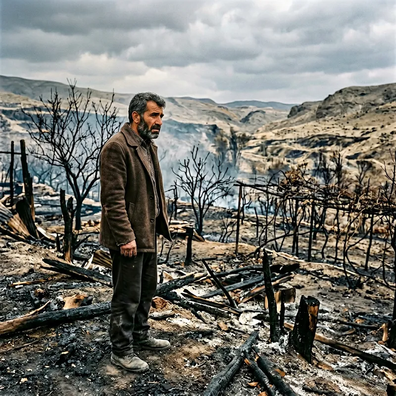 An image of a man, of Middle-Eastern descent, standing in a vast landscape, surveying his once lush garden that has now been destroyed and charred. His face is a mask of disbelief and sorrow as he gazes upon the blackened remains of his once verdant oasis, reduced to smoky ruin.