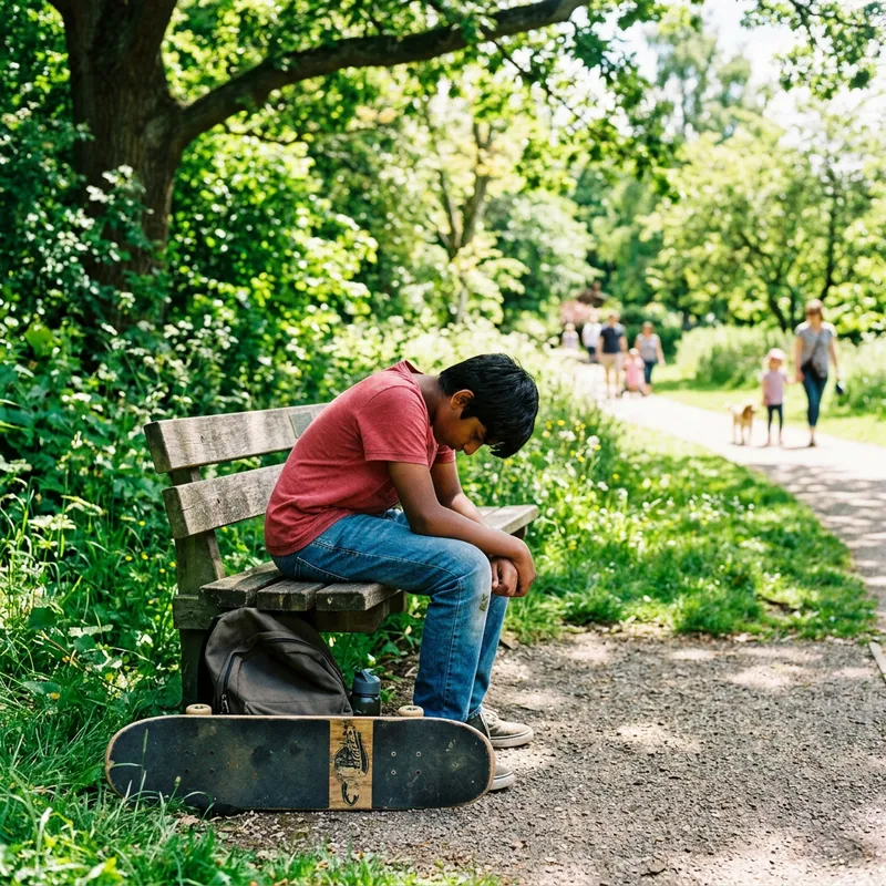 An image of a disheartened male child resting on a park bench. This South Asian boy, in his early teens, sits alone, hunched over, his head hung low to portray his sadness. His expression is one of heartbreak. He's dressed casually in a red shirt with blue jeans. The park setting around him is vibrantly green, painting a contrast to his gloomy demeanor. It's a sunny day but the sun's brightness does not seem to reach him, hinting at his inner turmoil. An untended skateboard lies on the ground beside the bench, neglected for the time being.