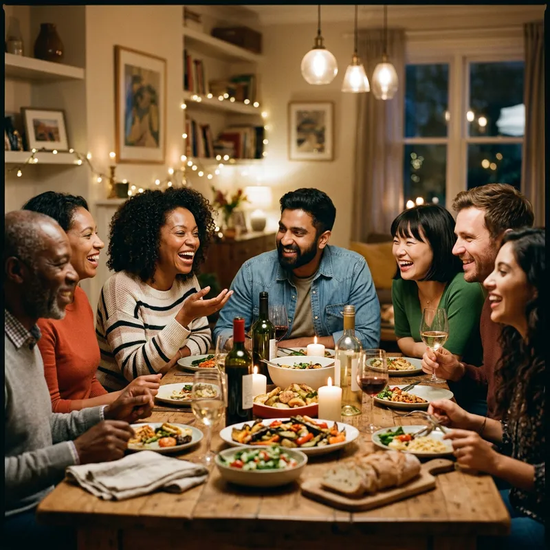 A heartwarming scene with a diverse group of friends, all of varying descents and genders, laughing and engaging in conversation at an intimate dinner party. They are gathered around a rustic, wooden table abundant with delectable dishes, under the flattering, warm light casting a cozy ambiance. Vintage aura is invoked through imagery, akin to a capture from a film camera with f/1.8 aperture and 50mm focal length. The expressions are candid, emphasizing the genuine happiness and interaction.