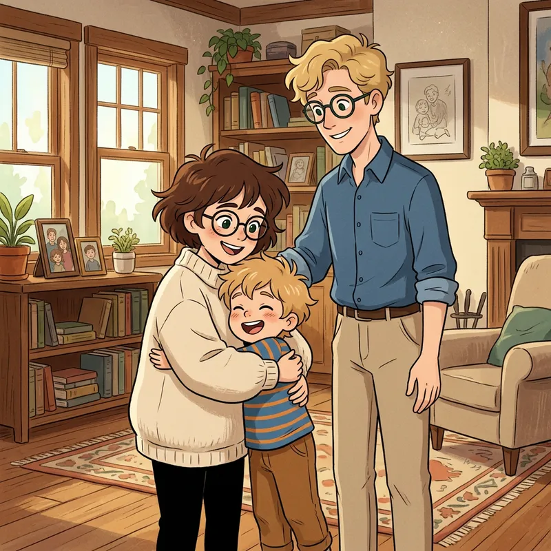 Scene from an animated show. A petite woman with short brown hair and dark green eyes, wearing glasses and a soft, oversized white sweater with black pants. She is smiling and hugging a small boy with light blond hair and dark green eyes. Standing nearby is a tall man with blond hair and round dark green glasses, dressed in a blue shirt and beige pants. His hand rests comfortably on the woman's shoulder.