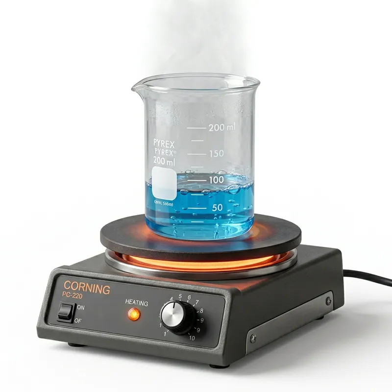 An image of a straight chemical glass filled up to one quarter with a blue liquid. The glass is placed on a chemical stove that's heating the liquid with an element. All of this is happening in a setting that has a transparent background.