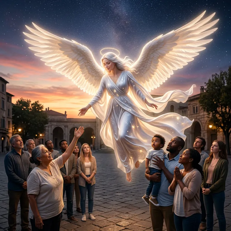 A heavenly angel named Linh, with flowing, silken white robes and bright, majestic wings, is extending her helping hand towards people in need. She possesses an ethereal beauty and her compassionate demeanor radiates divine energy. The people around her, from various descents such as Caucasian, Black, and Hispanic, are looking up in awe at her grace and benevolence. She is set against a twilight sky filled with a serene sunset transforming into a stary night, signifying hope amidst the darkness.