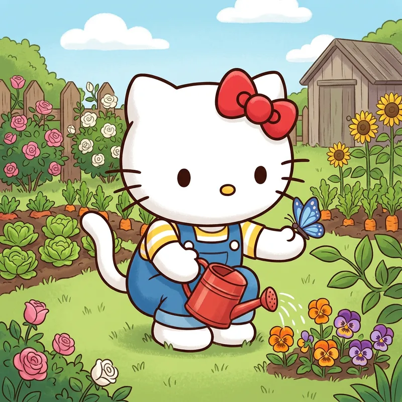 A friendly, fictional character that is a small, white, anthropomorphic cartoon cat with a red bow on its left ear. The cartoon character has no mouth and possesses simple, round black eyes. This character is often seen in a variety of settings like playing in a garden, baking in a kitchen, or reading a book. Remember to maintain its cuteness, simplicity and innocence in the image.