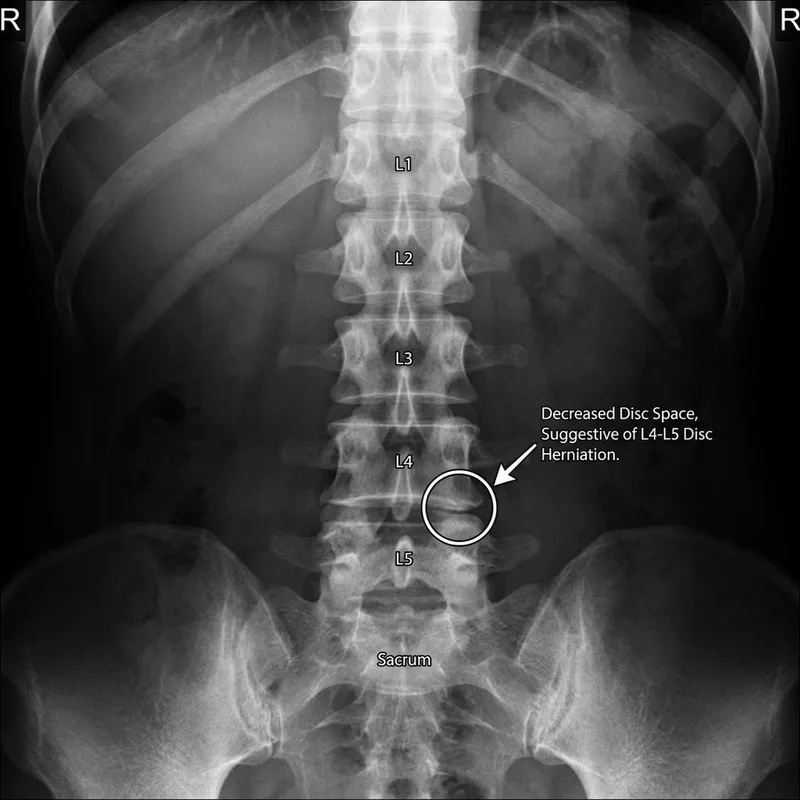 An X-ray image of a human spine, viewed from behind, showcasing a herniated disc condition. The person's back is exposed to show the middle portion of the vertebrae, where the lumbar discs are located.