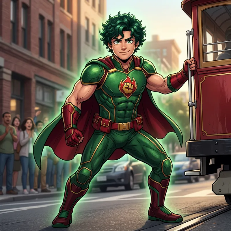 Illustrate a heroic teenager with curly green hair who inherits mightiness from his father. The boy should also possess a unique, physical strength-related ability. He is seen flaunting a well-built and muscular physique, showcasing an embodiment of strength and resilience. His compelling eyes should reflect a burning determination to protect and serve, commonly seen in superheroes. His costume should be dominated by vibrant greens and reds, emulating a synergy of power and valor. His image should radiate a prodigious aura of fearlessness while carrying an approachable warm smile.