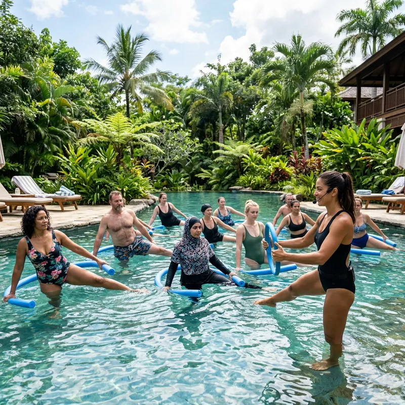 A hydro pilates class, led by a woman named Thais, taking place in a serene pool. The participants, a mixture of men and women of various descents including Hispanic, Caucasian, and Middle-Eastern, are engaged in exercises requiring balance and strength. The water gently ripples around them, reflecting light in a calming spectacle, while the surroundings feature lush greenery and the bright, clear sky above.