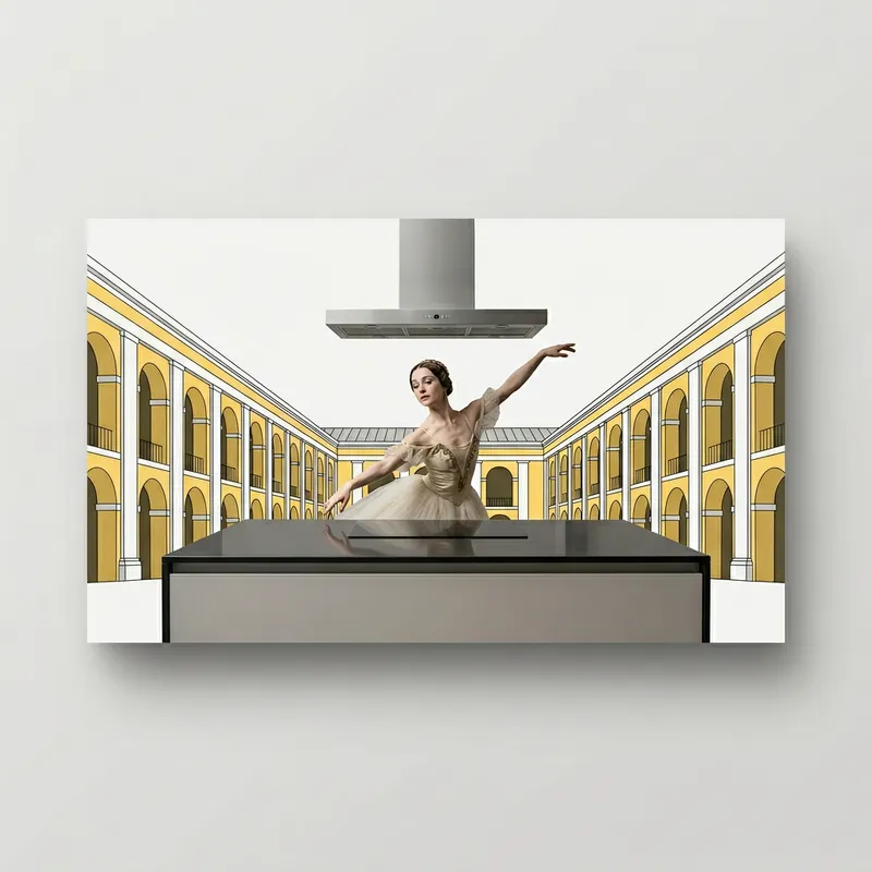 Create a high-resolution, print-ready, studio-lit photo representation of a rectangular invitation ticket to the ballet. The main artistic depiction on the ticket is a ballerina. She is emulating a ballet from the era of Sergei Diaghilev, establishing a deep sense of nostalgia. Counterbalancing the traditional element of the ballerina, she stands at a sleek, modern kitchen island under a stainless steel range hood. Her elegant pose demonstrates the fusion of old and new influences in Russian ballet. Nestled behind the unique scenario is a precise, two-dimensional depiction of the stunning architectural facades of Gostiny Dvor in Moscow. The image is without perspective and distortion to accentuate the simplistic, direct nature of the design. Note, there is no text on this invitation. The entire tableau is designed to resemble a photograph taken by a Canon EOS R with studio lighting, reflecting the genre inspired by ballet.