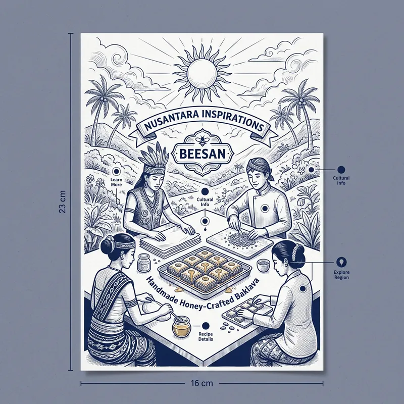 Create a high-resolution horizontal illustration using sketching and shading techniques with a navy and white minimalist color palette. The dimensions of the illustration are 23 cm in height and 16 cm in width. The scene depicts a magical orchard with coconut palms, rolling hills, and a sun. Various characters, each representing Dayak, Sumba, Javanese, and Sundanese cultures, work together to create baklava, depicted in the center of the image. Seamlessly worked into the design are branding elements like 'BEESAN,' 'Nusantara Inspirations,' and 'Handmade Honey-Crafted Baklava'. To add depth and engage users, dot elements designed for an interactive digital experience are integrated into the UI.