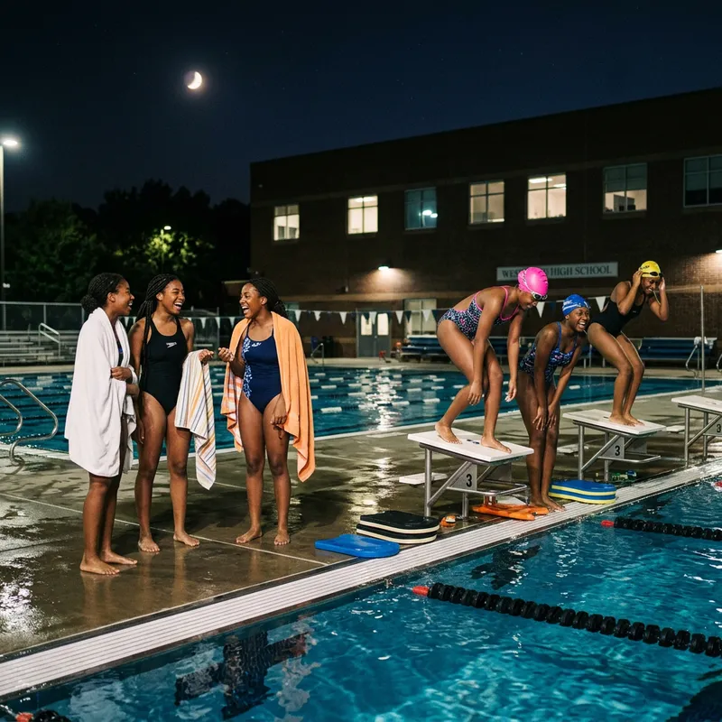 Enchanting High School Black Female Students Nighttime Pool Gathering
