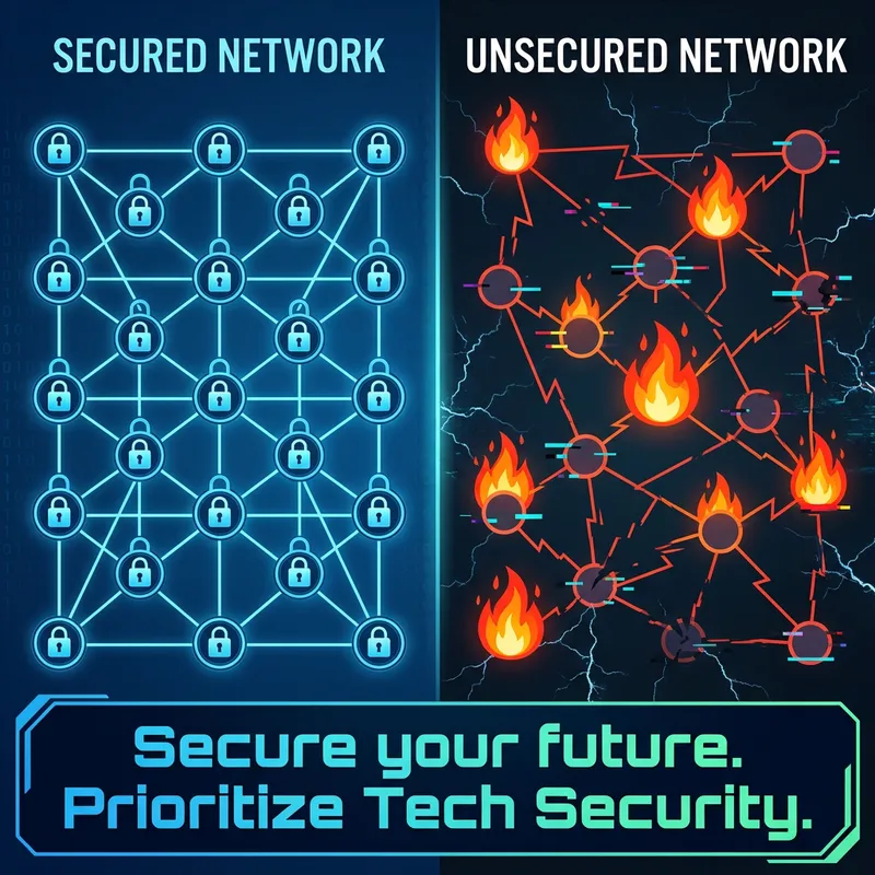 Graphic representation of a high-tech security system. The image is divided into two sections, showing a contrast between a secure and insecure process. On one side, we see an orderly, secured network with symmetric, interconnected nodes symbolizing a secure environment. Nodes are locked with digital padlocks, symbolizing encryption. On the other side, there is a chaotic, unsecured network, with fragmented, loosely connected nodes, with some nodes in flames, symbolizing malware attacks. The bottom of the poster houses a bold, eye-catching slogan in stylized letters, reading: 'Secure your future. Prioritize Tech Security.'